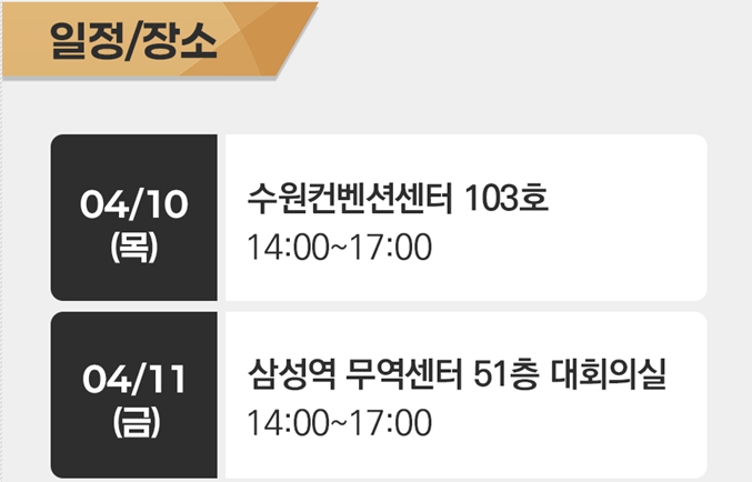 특강은 수원, 서울 두 지역에서 진행되며, 4월 10일(목) 수원컨벤션센터(광교중앙역)에서, 4월 11일(금) 한국무역센터(삼성역)에서 각각 열린다. 두 세미나 모두 시간은 오후 2시부터 5시까지다. 150명 한정좌석 강의로 인기가 많은 세미나인만큼 빠른 예약 마감이 예상된다.