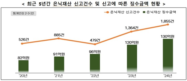 28일 국세청이 발간한 `24년 국세통계연보에 따르면 지난 한해 접수된 은닉재산 신고건수는 1855건이었으며, 신고된 은닉재산에 대한 징수활동으로 130억원을 징수한 것으로 나타났다.