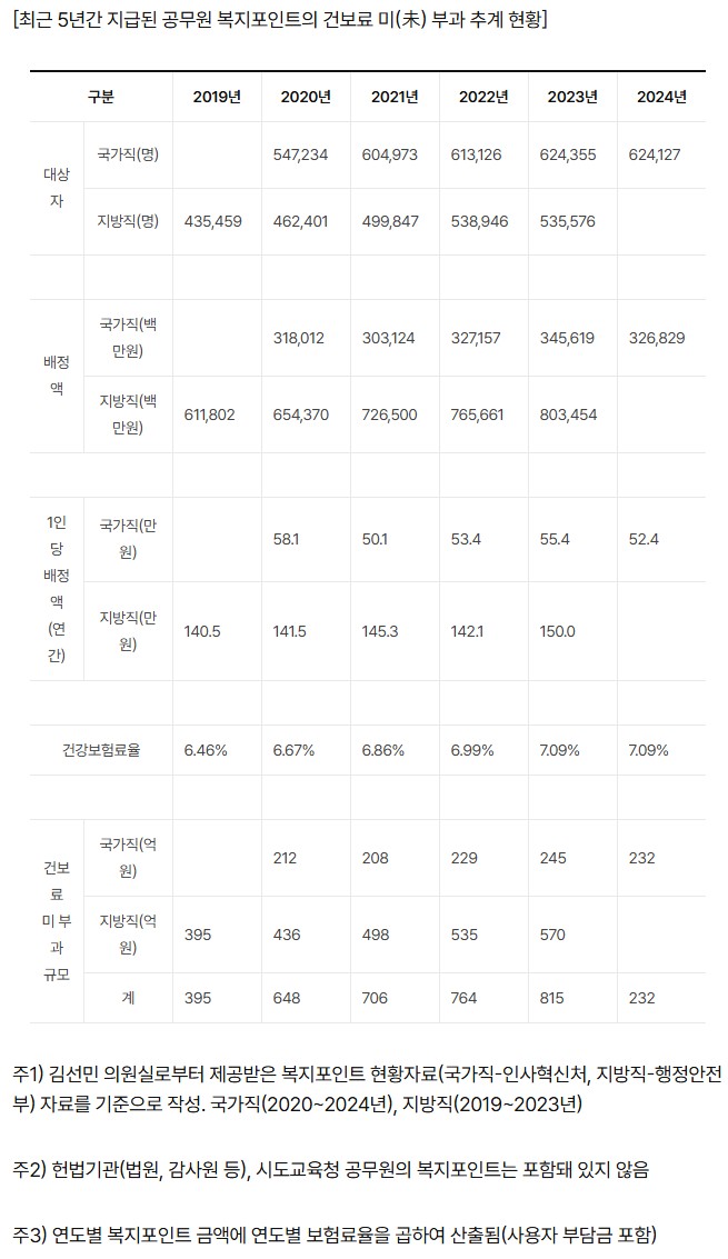 28일 국회 보건복지위원회 김선민 의원(조국혁신당)이 인사혁신처와 행정안전부에서 받은 공무원 복지포인트 배정현황 자료를 건강보험공단에 문의해 분석한 결과를 보면 최근 5년간 국가직(2020∼2024년)과 지방직(2019∼2023년) 공무원에게 지급된 복지포인트는 총 5조1천825억2천800만원에 달했다.