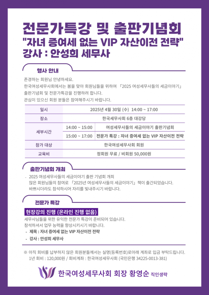 전문가 특강은 상속-증여세 전문 안성희 세무사( 세무법인 현인 대표)의 ‘자녀 증여세 없는 VIP 자산이전 전략’이 2시간 동안 강연된다.