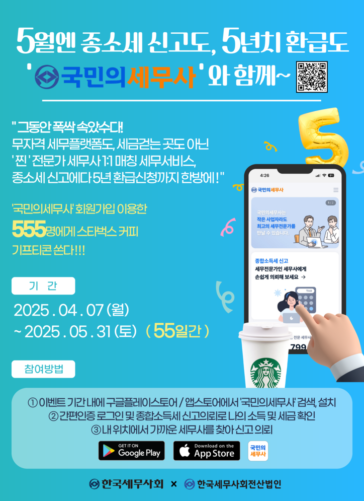 한국세무사회와 한국세무사회전산법인(대표이사 송명준)은 ‘국민의세무사’앱 출시와 본격적인 가동을 맞아 내달 31일까지 이벤트도 진행한다. 이 기간 내에 ‘국민의세무사’ 앱에 신규 가입한 사용자 중 추첨을 통해 총 555명에게 스타벅스 커피 기프티콘을 증정한다. 이벤트 참여는 간단히 QR 등을 통해 앱 설치 후 카카오톡 본인인증을 완료하면 자동 응모된다.