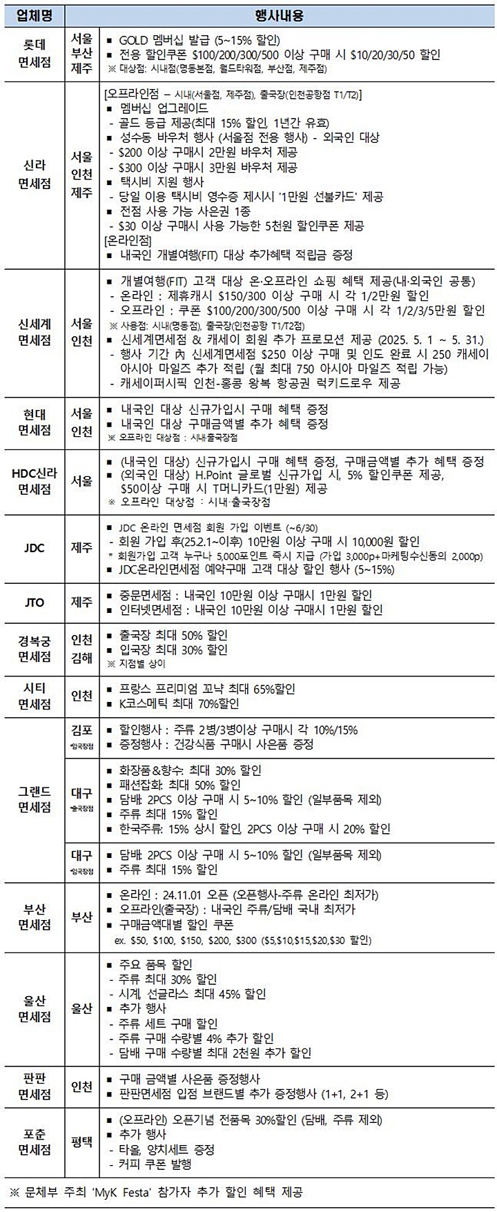 관세청에 따르면, 인천과 서울, 부산, 제주 등 전국 14개 면세점 업체가 참여해 온·오프라인 최대 50% 가격할인, 사은품 증정 등 혜택이 제공되며, 문화체육관광부가 주최하는 한류 종합행사 ‘MyK Festa(마이케이페스타)’ 참가자에게는 추가 할인도 적용된다.