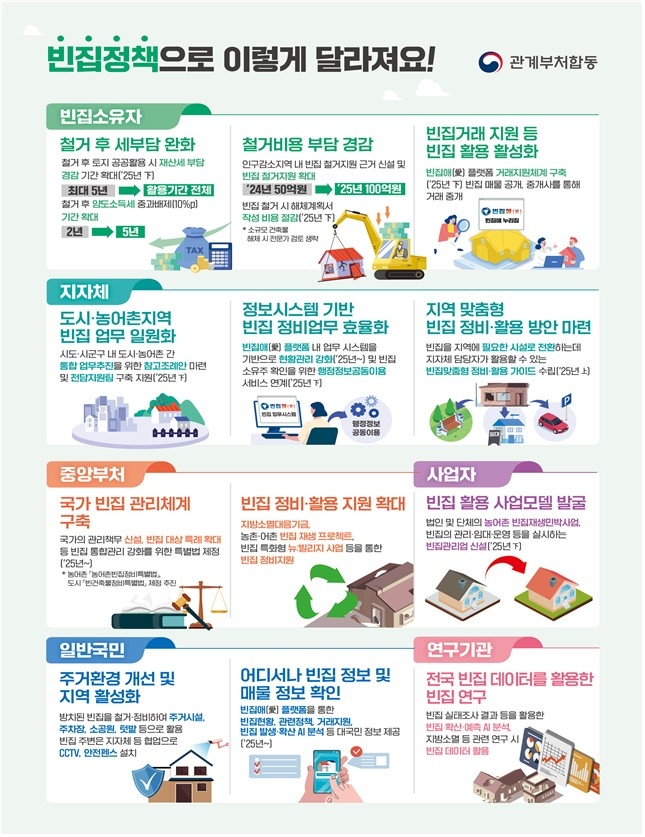 이를 통해 그간 시군구에 맡겨졌던 빈집 관리를 국가와 시도, 시군구, 소유자가 함께 책임지는 구조로 전환한다. 농어촌과 도시 간 관리 기준도 일원화한다.