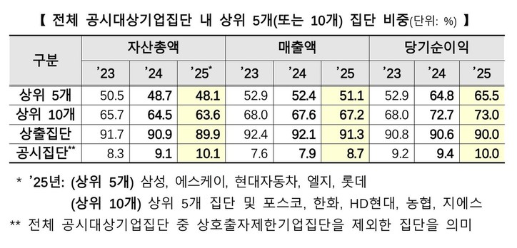 5대 그룹의 자산·매출·순이익 비중이 2023년 50.5%·52.9%·52.9%, 2024년 48.7%·52.4%·64.8%였던 것과 비교해 보면 자산·매출액은 미미하게 줄었지만 순이익은 커진 흐름이다.