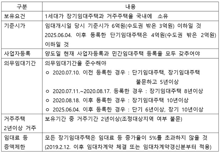 양도일 현재 장기임대주택과 거주주택을 보유한 거주자가 거주주택(2년이상 보유 및 2년이상 거주)을 양도하는 경우 장기임대주택은 주택으로 보지 않고 거주주택을 1세대 1주택으로 보아 양도소득세를 비과세합니다.