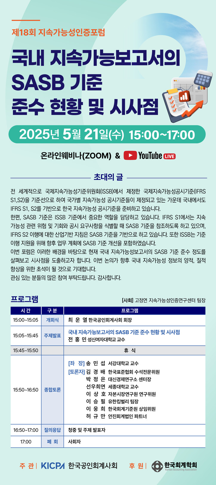 종합토론의 좌장은 송민섭 서강대학교 교수가 맡으며 △김경배 한국표준협회 수석전문위원 △박정은 대신경제연구소 본부장 △선우희연 세종대학교 교수 △이상호 자본시장연구원 연구위원 △이승필 유한킴벌리 팀장 △이웅희 한국회계기준원 상임위원 △허규만 안진회계법인 파트너가 토론자로 참여한다.