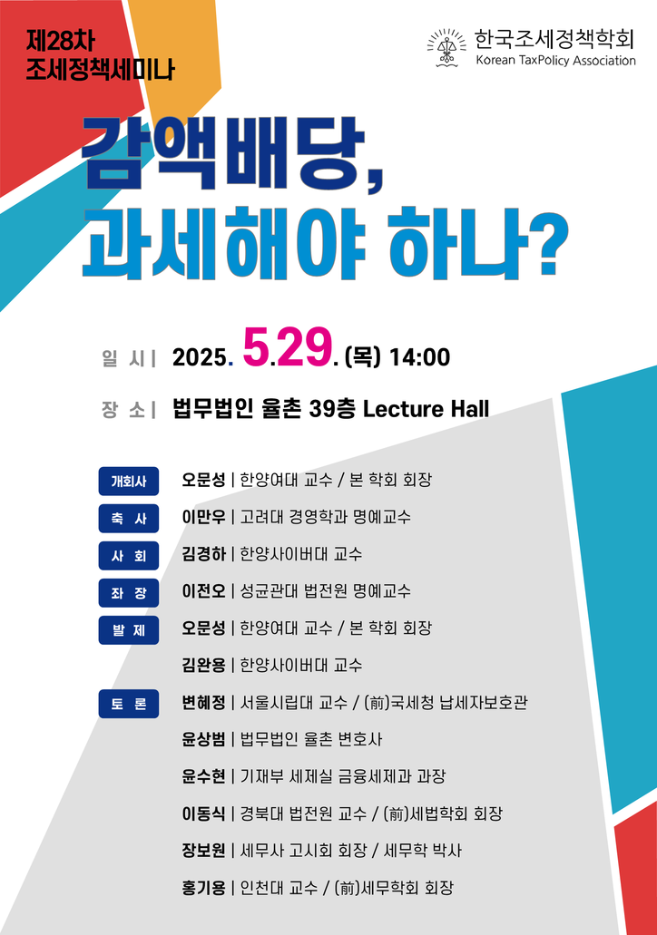 한국조세정책학회(회장 오문성)는 29일 오후 2시 법무법인 율촌 Lecture Hall에서 ‘감액배당, 과세해야 하나?’를 주제로 제28차 조세정책 세미나를 개최했다.