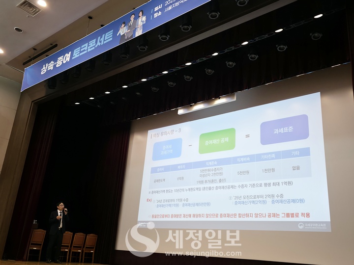 이어 국세청 출신의 김호용 세무사(필명 미네르바 올빼미)는 상속증여세 주요 이슈에 대한 강의를 이어갔다. 상속세 과세 계산구조를 강의한 뒤 곧바로 사전증여를 통한 절세 사례를 설명하면서, 증여는 빠르면 빠를수록 좋다고 조언했다.