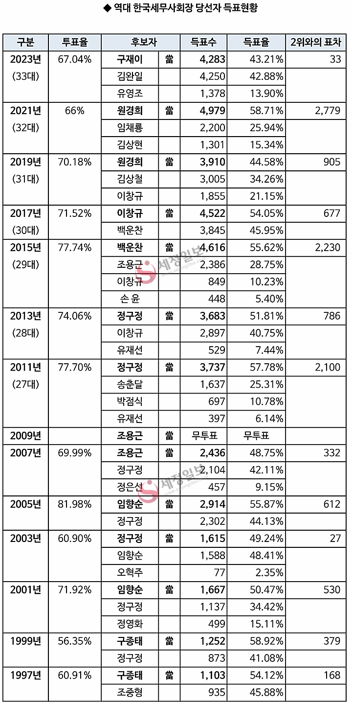 2003년 정구정 전 세무사회장이 임향순, 오혁주 후보와 삼파전에서 27표 차이로 임 후보를 누르고 당선된 이후 가장 적은 표 차이였다.