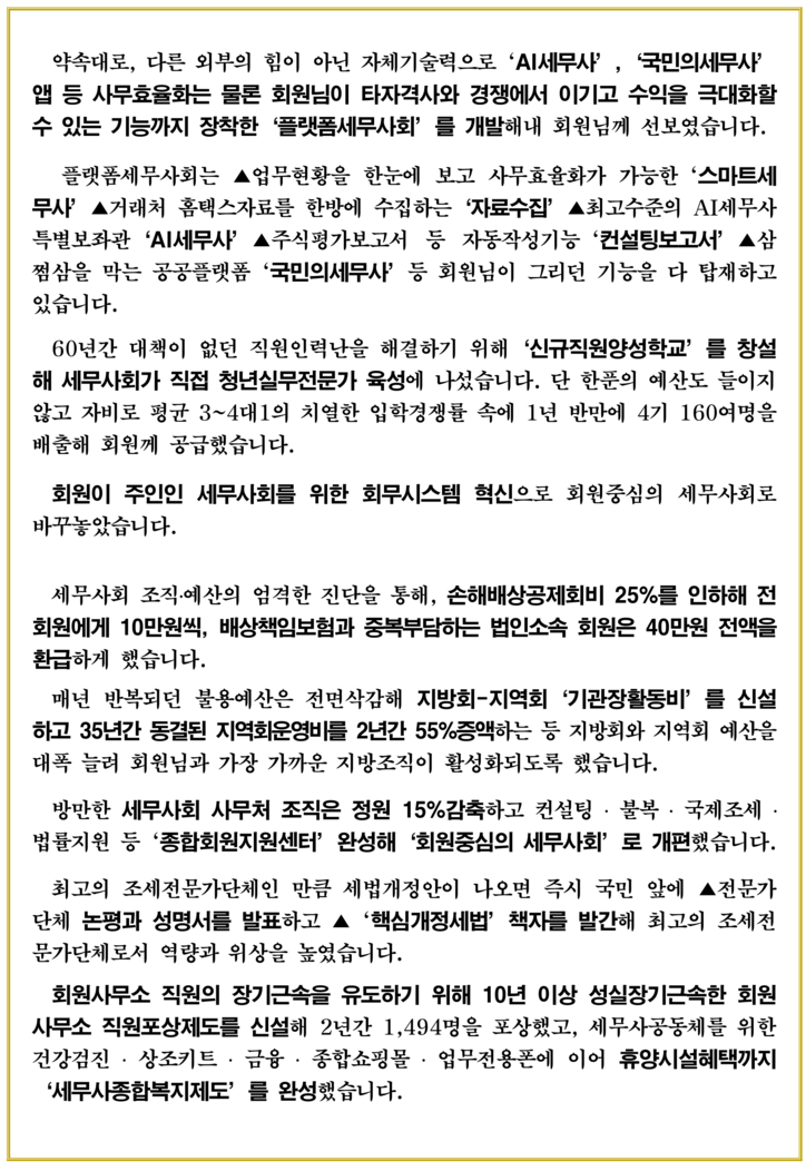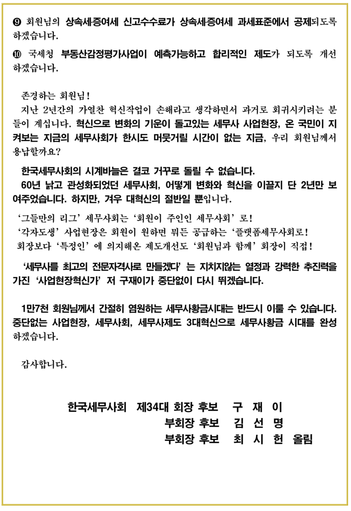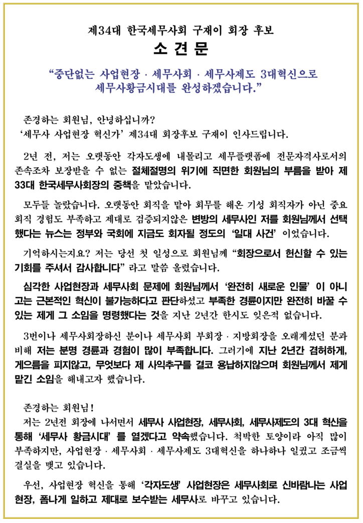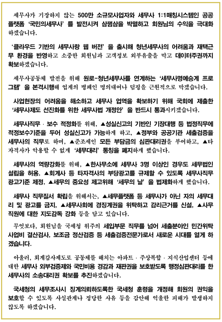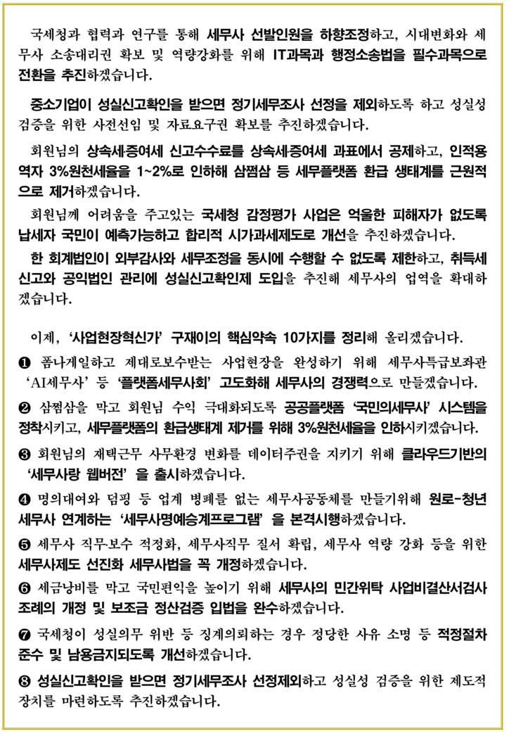 세정일보 sejungilbo@sejungilbo.com 기자의 다른기사 저작권자 © 세정일보 무단전재 및 재배포 금지 관련기사 [`25 세선] 구재이 회장 후보 “3대혁신으로 세무사 황금시대 완성할 것” 최신 기사 차규근 “배당소득 분리과세율 인하 수용못한다…초부자 감세, 불평등만 심화” 관세사회, 우원식 국회의장 면담…성실신고확인제 필요성 설명 [현장] ‘국세공무원의 꽃’ `25년 하반기 서기관 승진자 30명에 임명장 수여식 국세청, ‘기획·정보·대변인실’ 사무관 자리 하나씩 늘린다 동아쏘시오그룹, 중대재해 대응 모의훈련 실시···심폐소생술·자동심장충격기 실습 NH농협은행, 2025년 ‘디지털금융 혁신대상‘ 최종 우수사례 선정 韓 3분기 경제성장률 26개국 중 3위…내년 2.3% 전망도 등장 차규근 “배당소득 분리과세율 인하 수용못한다…초부자 감세, 불평등만 심화” 추천기사 국세청, 태광산업 세무조사 ‘인프라·레저 계열사’까지…‘5년 치 장부’ 뒤진다 론스타와 13년 분쟁, 국제투자분쟁에서 최초 ‘대한민국 승’…조세주권 지켰다 국세청, 세무공무원 출신 세무사 등 ‘세금 유튜버’ 전수 확인했다 상속세 과세, 유산취득세로 변경 시 ‘국세청 세무조사 조항’도 바뀐다 '마약의 나라' 되나?…청년층 타깃 클럽마약 '케타민의 급습' 5년간 7.3배 급증 [세미콜론] 아직도 이런 폐습이~…국세청 ‘간부 모시는 날’ 고강도 감찰