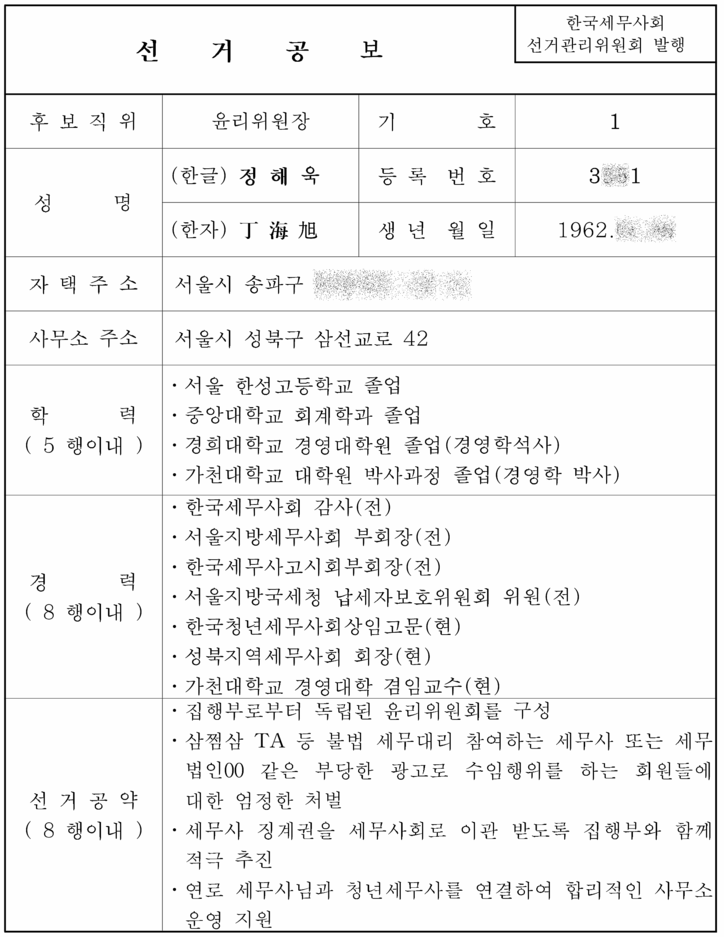 정해욱 후보는 한국세무사회 감사, 서울세무사회 부회장, 세무사고시회부회장 등을 역임했으며 현재 한국청년세무사회상임고문, 성북지역세무사회장을 맡고 있다.