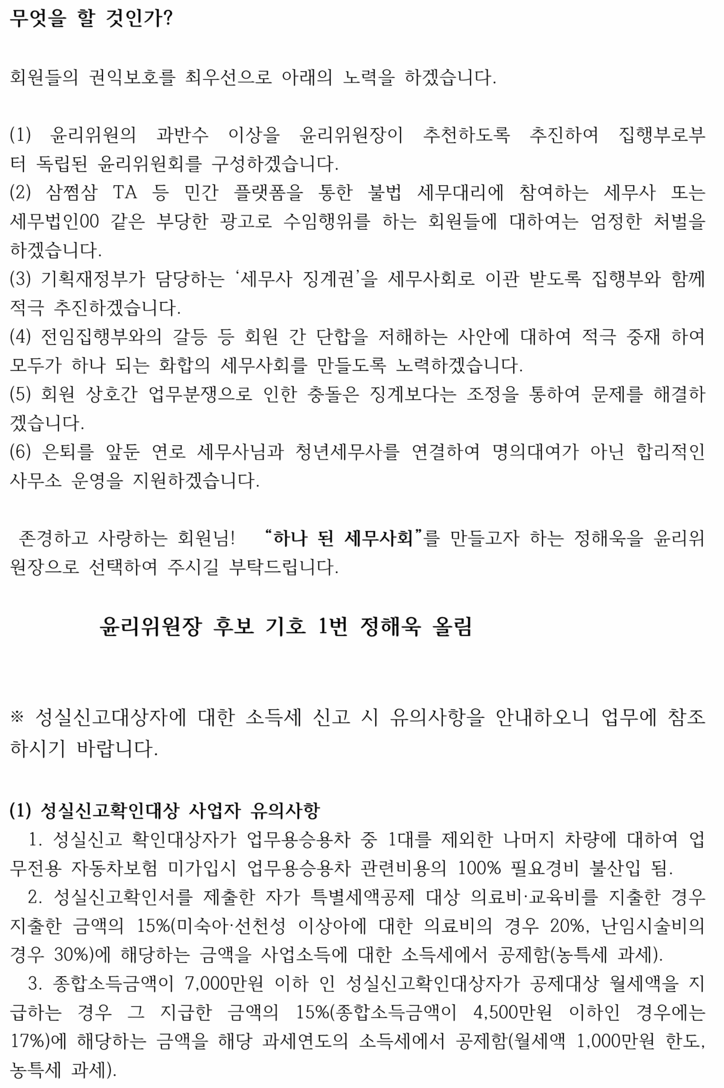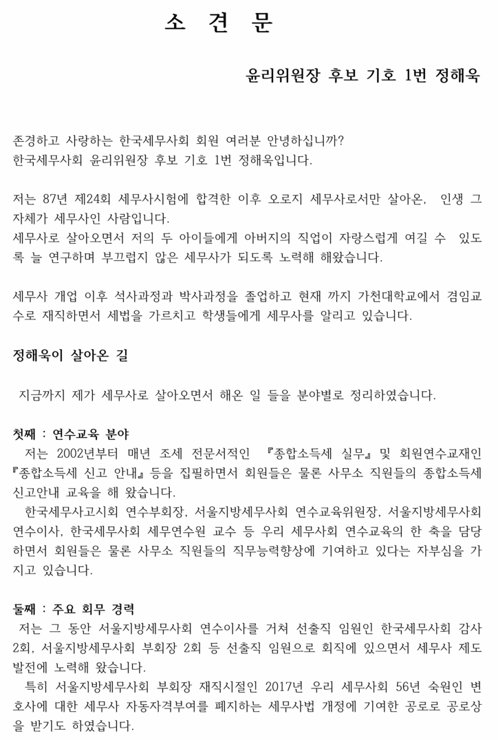 5일 한국세무사회가 공개한 임원 선거 소견문에서 윤리위원장 후보 기호 1번 정해욱 후보는 “세무사회는 양 진영으로 갈라져 서로 헐뜯고 비방하는 갈등의 역사가 반복돼 왔다”며 “중간에서 중재하고 조정하는 역할은 징계를 담당하는 윤리위원장이라고 생각된다”며 출마 이유를 밝혔다.