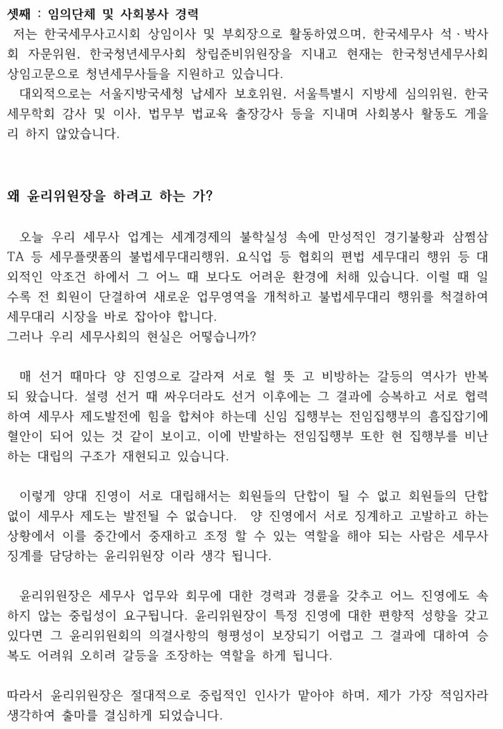 정해욱 후보는 “양대 진영이 서로 대립해서는 회원들이 단합될 수 없고, 회원들의 단합 없이 세무사제도는 발전할 수 없다”고 강조했다.