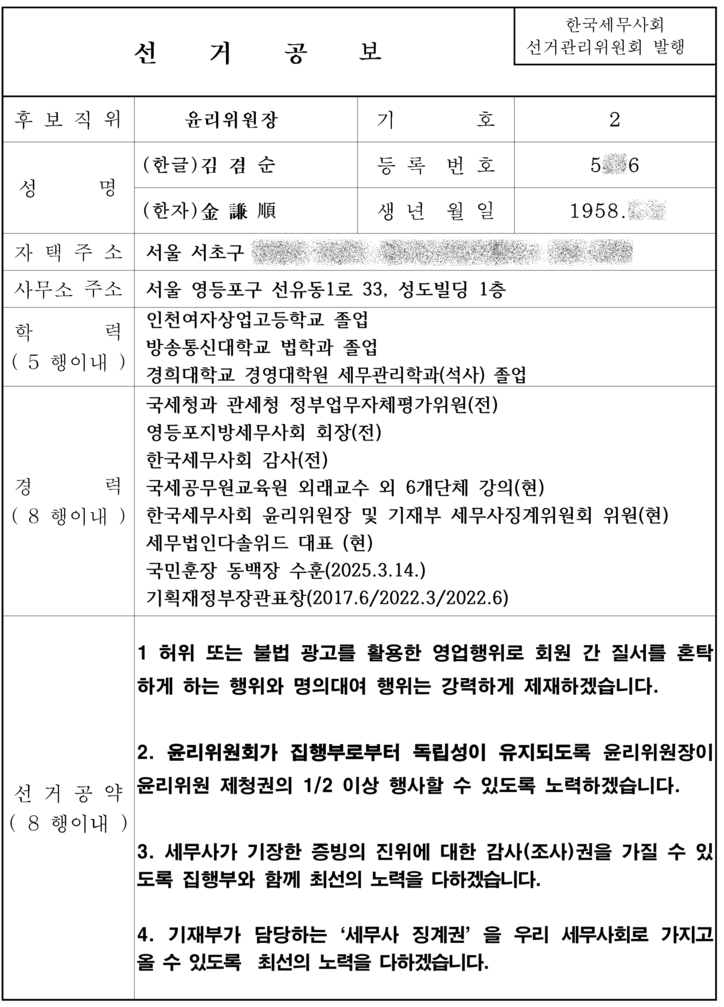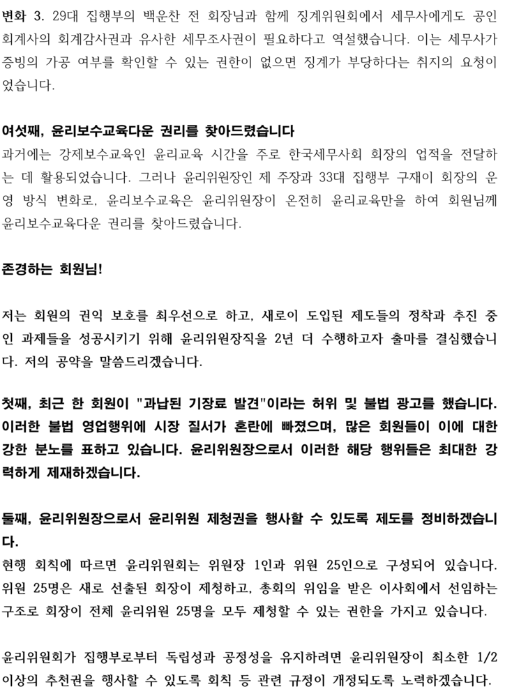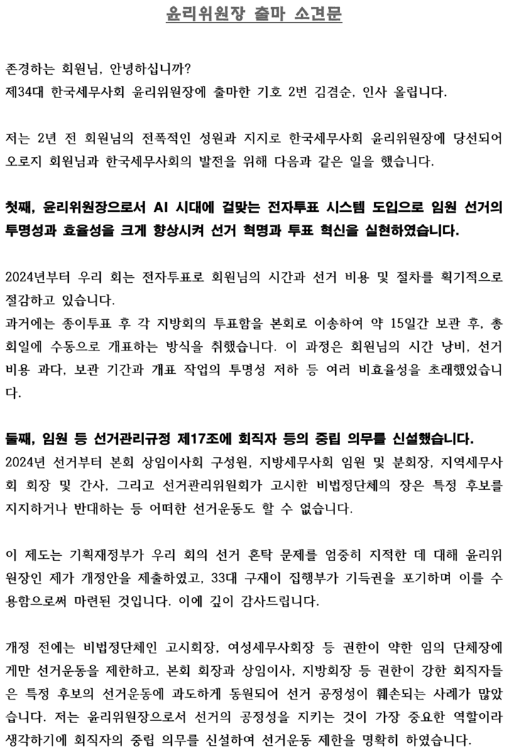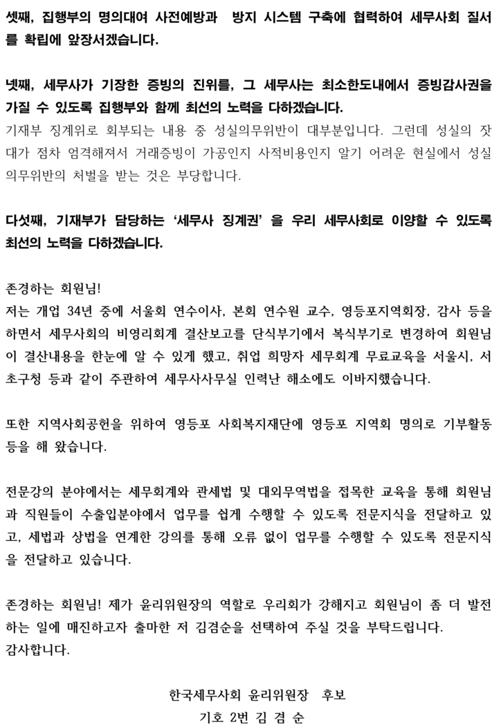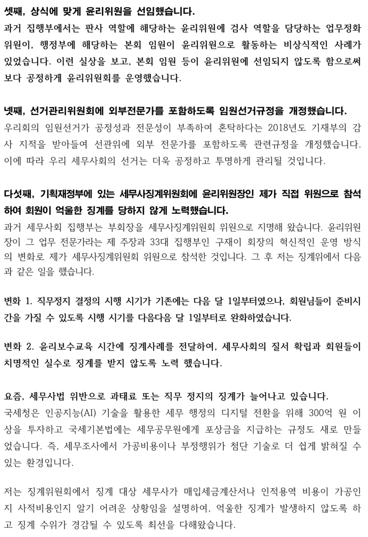 김 후보는 지난 2년의 성과로 △전자투표 시스템 도입 △임원 선거에 회직자의 중립의무 신설 △공정한 윤리위원회 운영 △선관위에 외부전문가 포함토록 규정 개정 △세무사징계위에 윤리위원장 직접 참석 등을 언급했다.