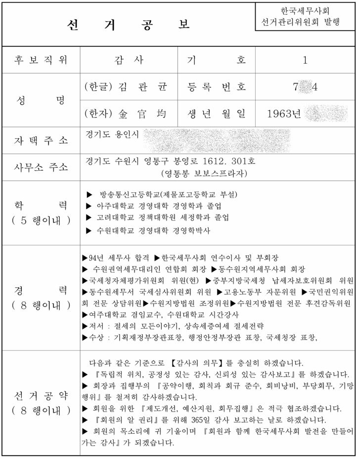 또한 △회원을 위한 제도개선에는 적극 협조 △회원의 직접 이익을 위한 예산지원은 적극 협조 △회원의 직접 이익을 위한 회무집행은 적극 협조하며, △회원의 알 권리를 위해 365일 감사보고 할 것 △회원과 함께 세무사회 발전을 만들어가는 감사가 될 것 등을 공약으로 밝혔다.