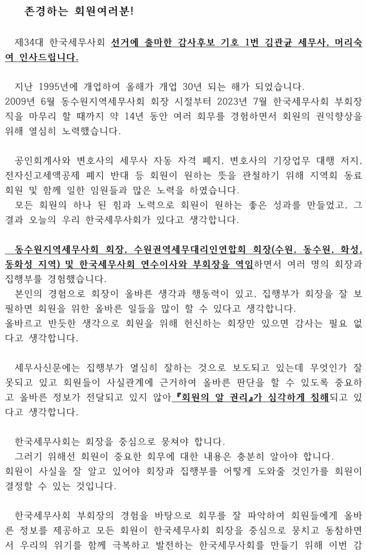 김관균 한국세무사회 감사 후보가 “세무사신문에 올바른 정보가 전달되고 있지 않아 ‘회원의 알 권리’가 심각하게 침해되고 있다”며 “회원에게 올바른 정보를 제공해야 한다”며 선거 출마 이유를 밝혔다.