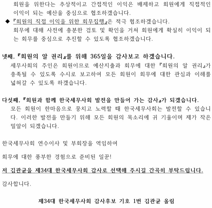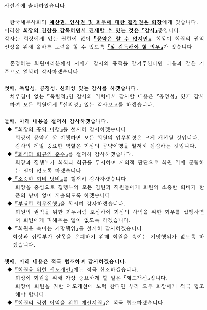그러면서 △독립성, 공정성, 신뢰성 있는 감사를 할 것이라고 약속하면서 △회장의 공약 이행을 철저히 감사 △회칙과 회규의 준수를 철저히 감사 △소중한 회비 낭비를 철저히 감사 △부당한 회무집행을 철저히 감사 △회원을 속이는 기망행위를 철저히 감사하겠다고 밝혔다.