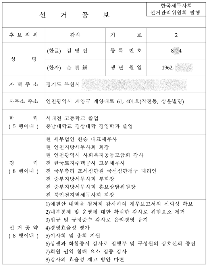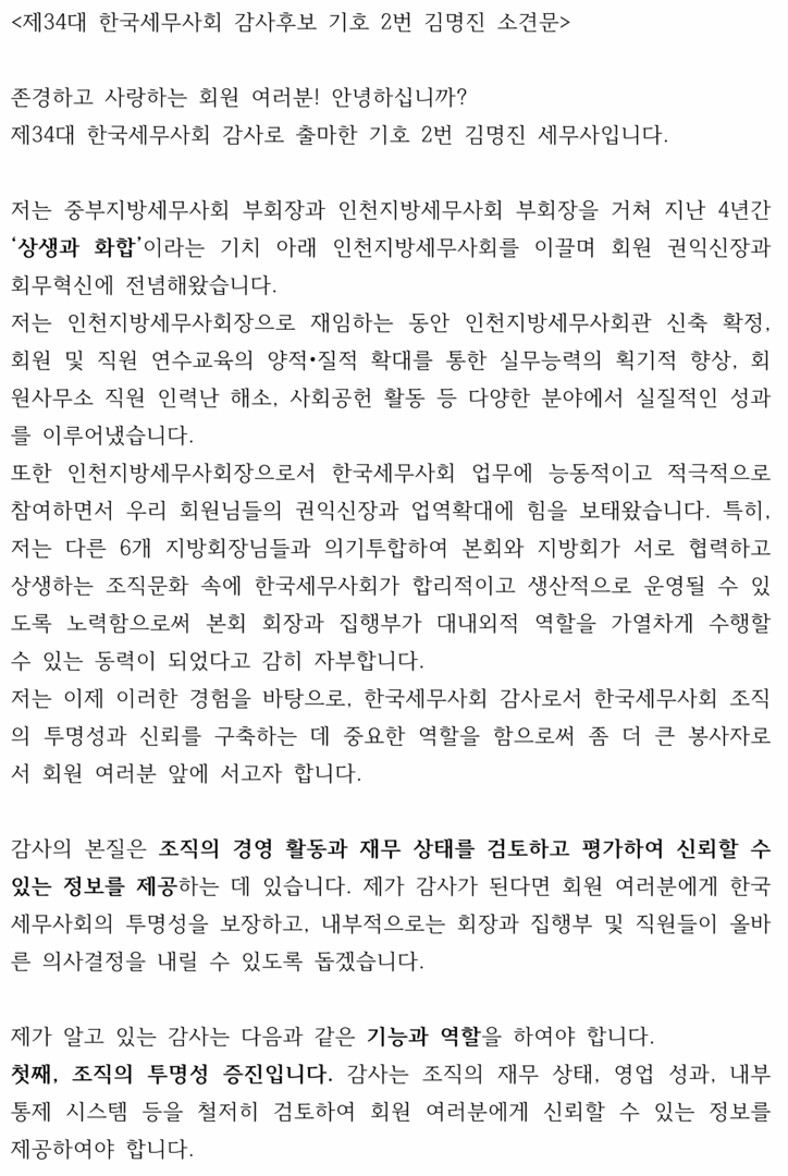 5일 한국세무사회가 공개한 임원 선거 소견문에서 감사 후보 기호 2번 김명진 후보는 “한국세무사회 조직의 투명성과 신뢰를 구축하는데 중요한 역할을 해 좀 더 큰 봉사자로 서고자 한다”며 출마 이유를 밝혔다.