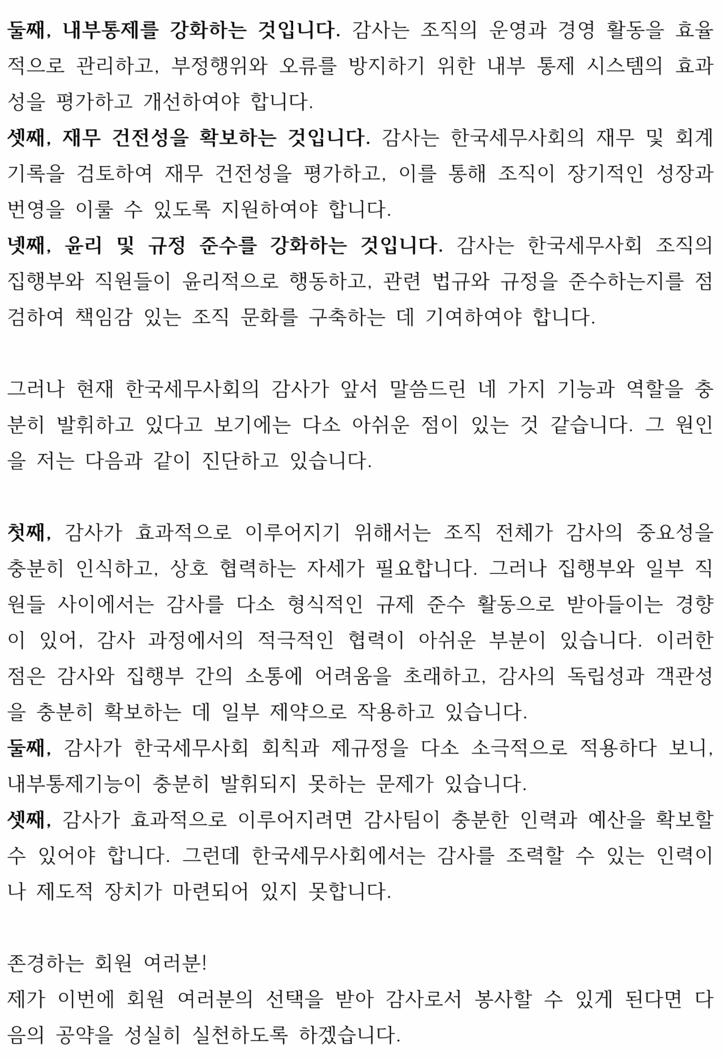 김 후보는 “감사는 조직의 투명성 증진, 내부통제 강화, 재무건전성 확보, 윤리 및 규정 준수 강화를 해야 하는데 현재 한국세무사회 감사가 네 가지 기능과 역할을 충분히 발휘하고 있다고 보기에는 다소 아쉽다”면서 “그 원인은 집행부와 일부 직원들 사이에 감사를 다소 형식적인 규제 준수 활동으로 받아들이는 경향이 있어 적극적인 협력이 아쉽고, 감사가 회칙과 제 규정을 다소 소극적으로 적용해 내부통제기능이 충분히 발휘되지 못한다. 또 감사를 조력할 인력이나 제도적 장치가 마련되지 않았다”고 지적했다.