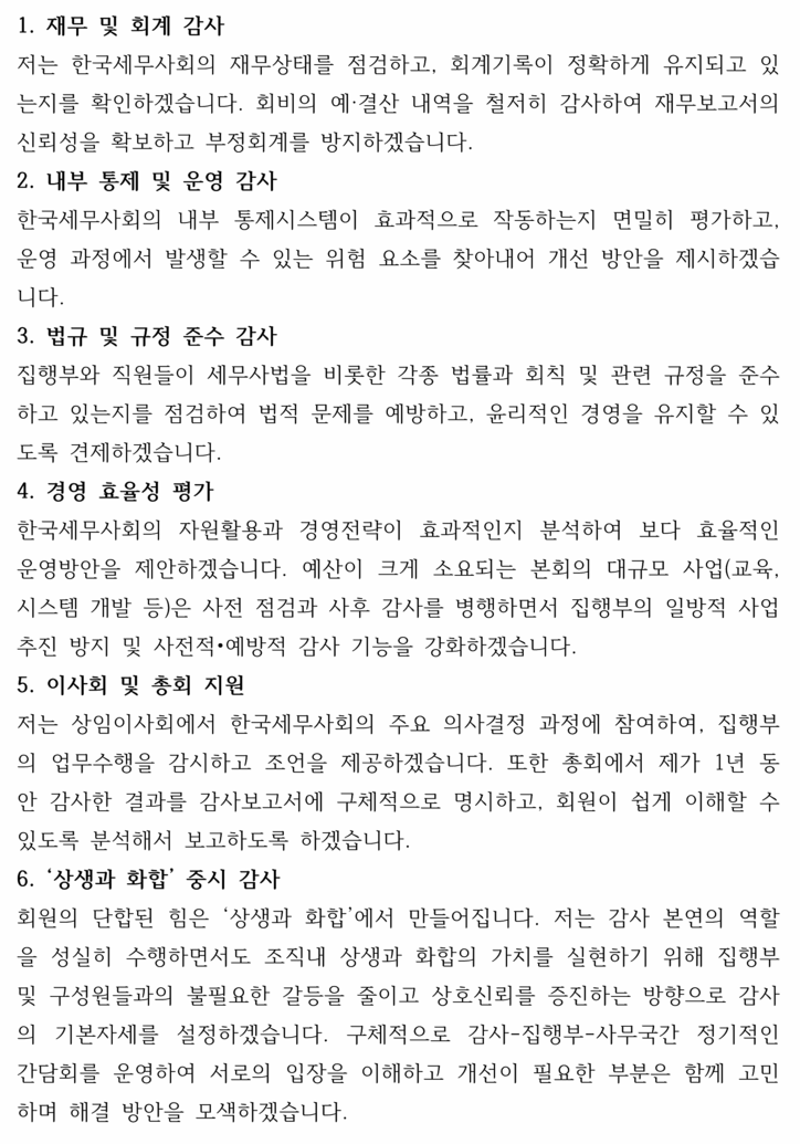 그러면서 △재무 및 회계 감사로 재무보고서 신뢰성 확보 및 부정회계 방지 △세무사회 통제시스템 평가 및 운영 감사 △법률 및 회칙 준수를 점검해 법적문제 예방 및 경영 견제 △자원활용 및 경영전략 분석 △상임이사회 참여 등 총회 지원 △상생과 화합 중시 감사 △회원 권익침해 요소 철저 감사 △감사의 효율성 제고 방안 마련 등을 약속했다.