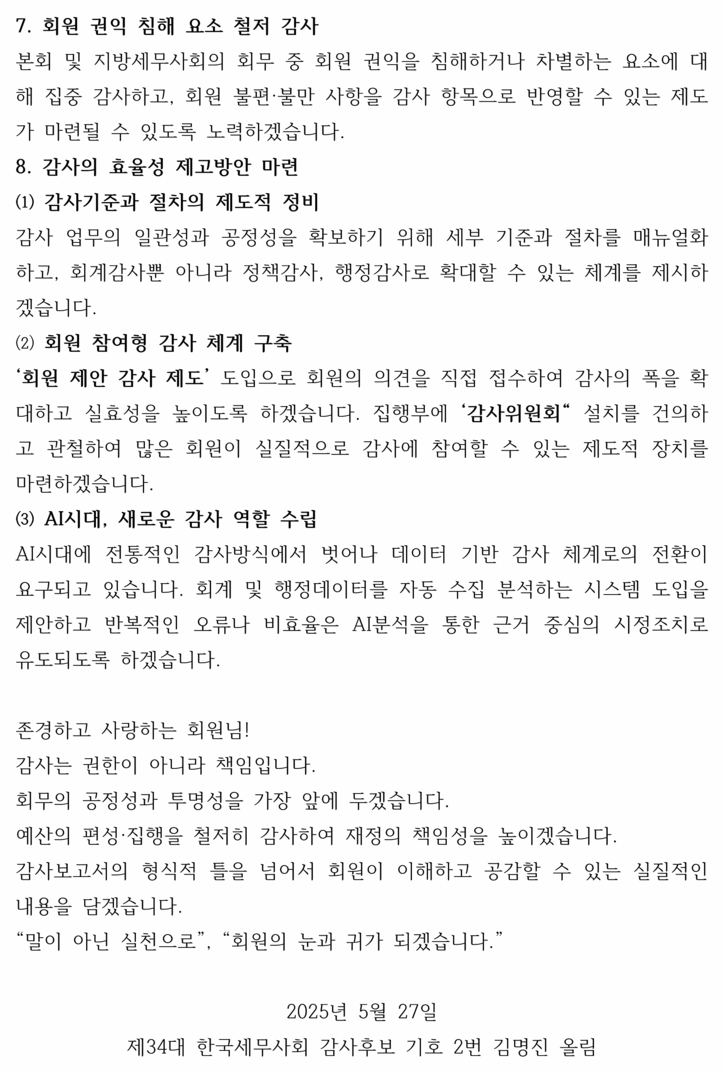 김 후보는 “감사의 본질은 조직의 경영 활동과 재무 상태를 검토하고 평가해 신뢰할 수 있는 정보를 제공하는 데 있다”며 “한국세무사회의 투명성을 보장하고 내부적으로는 회장과 집행부 및 직원들의 올바른 의사결정을 내릴 수 있도록 돕겠다”고 밝혔다.