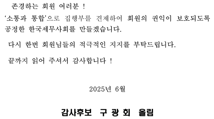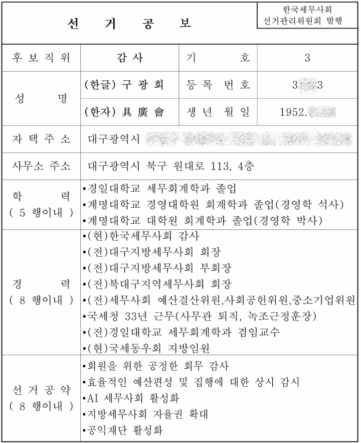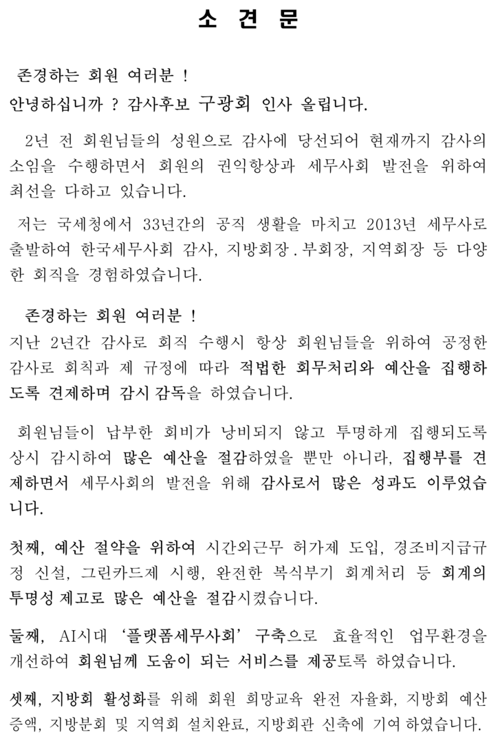 5일 한국세무사회가 공개한 임원 선거 소견문에서 기호 3번 구광회 감사 후보는 “지난 12여년간 다양한 회직 수행으로 세무사회 회무와 예산 집행에 대한 메커니즘을 누구보다도 잘 알고 있다”고 밝혔다.