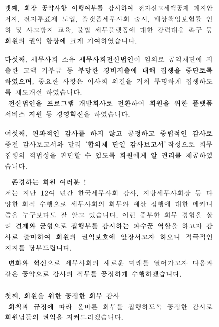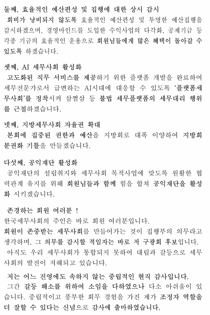 구 후보는 공약으로 △회원을 위한 공정한 회무 감사 △효율적인 예산편성 및 집행 상시 감시 △’플랫폼세무사회’ 정착으로 불법 플랫폼 세무대리 행위 근절 △본회 권한과 예산을 지방회로 대폭 이양 △공익재단 활성화 등을 내걸었다.