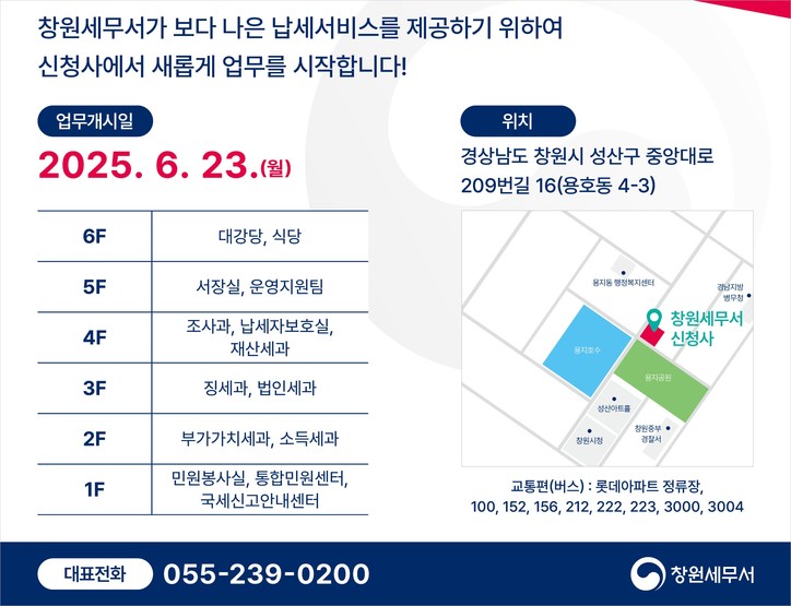 창원세무서(서장 허종)는 보다 나은 납세서비스를 제공하기 위해 오는 23일부터 신청사에서 새롭게 업무를 시작한다고 12일 전했다.
