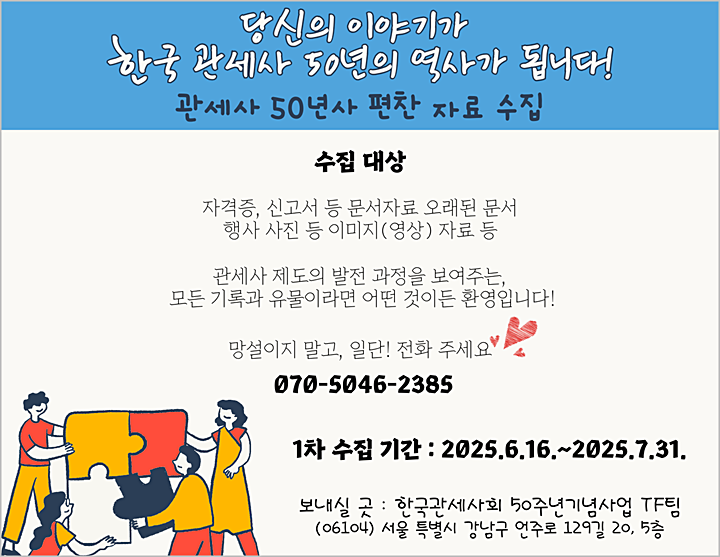 1차 수집기간은 내달 31일까지이며, 관세사회 50주년 기념사업팀에 문의하면 된다.