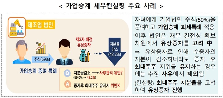 국세청이 가업승계 세제혜택을 적용받기 위해서는 엄격한 요건과 장기간에 걸친 준비가 필요함에도, 경제적인 부담으로 외부전문가의 컨설팅을 받기 어려운 소규모 중소기업을 대상으로 컨설팅을 집중 지원한다.