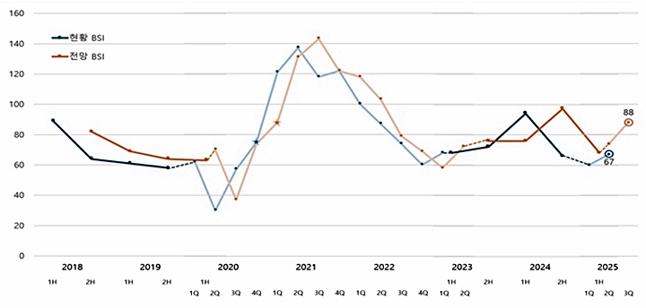 올해 3분기 전망 BSI(88)은 현황 BSI와 마찬가지로 경기가 부진할 것으로 전망했으나, 전기 대비 소폭 상승한 것으로 조사돼 경기회복에 대한 기대감이 커지고 있다. 대외환경 악화 가능성, 지정학적 리스크와 글로벌 공급망 이슈 해소 지연, 수출 동향 등 경기부진에 영향을 미치는 요인이 많음에도, 국내 정치 불안정이 해소되고 새 정부의 적극적 경기 대응 기대감이 긍정적인 영향을 미친 것으로 분석된다.