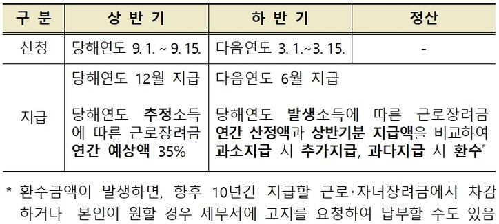 ◇ 소득 발생시점(’24년)과 장려금 지급시점(법령상 ’25년9월) 간 시차를 줄여 소득지원 및 근로유인 효과를 제고(2019년 귀속부터 도입)