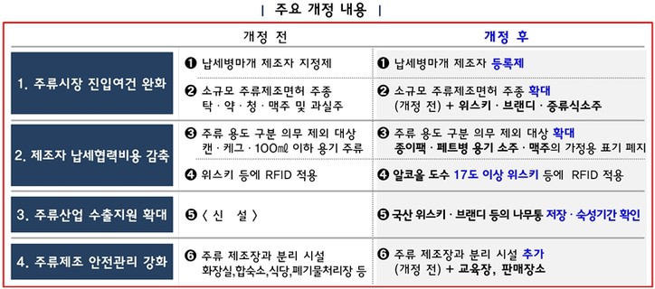 주로 가정용으로 소비되는 종이팩・페트병 용기 소주・맥주의 ‘가정용’ 용도 구분 의무를 폐지해 주류제조자의 납세협력비용을 감축하고, 위스키 등에 적용되는 RFID 태그 부착 의무를 알코올 도수 17도 이상의 위스키 등에만 적용하도록 개정해 주류 소비문화의 변화로 대중화된 하이볼 등 저도주류에 대한 행정절차를 간소화했다.