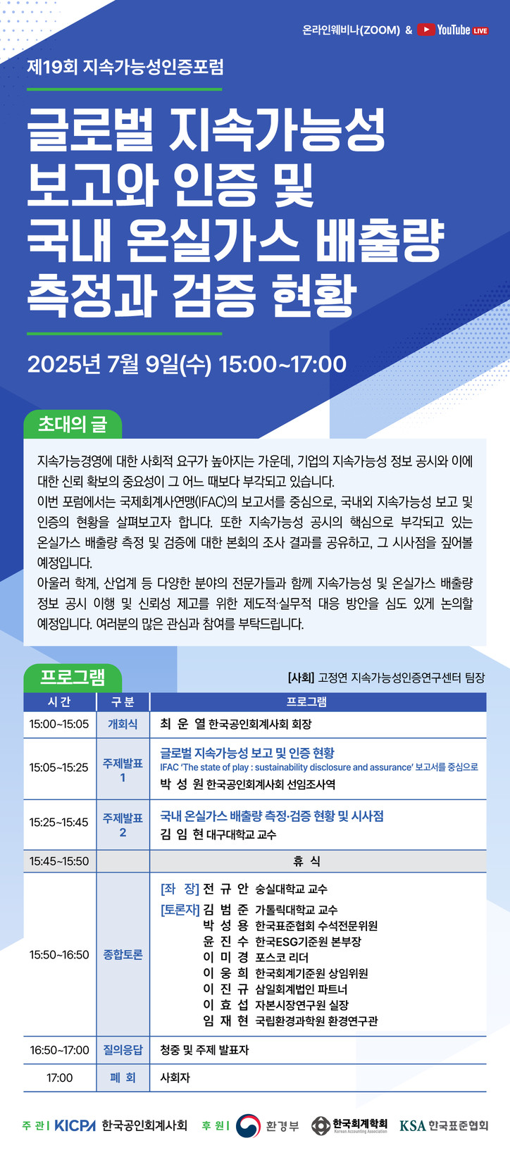 종합토론은 전규안 숭실대학교 교수가 좌장을 맡으며 △김범준 가톨릭대학교 교수 △박성용 한국표준협회 수석전문위원 △윤진수 한국ESG기준원 본부장 △이미경 포스코 리더 △이웅희 한국회계기준원 상임위원 △이진규 삼일회계법인 파트너 △이효섭 자본시장연구원 실장 △임재현 국립환경과학원 환경연구관이 토론자로 참여한다.