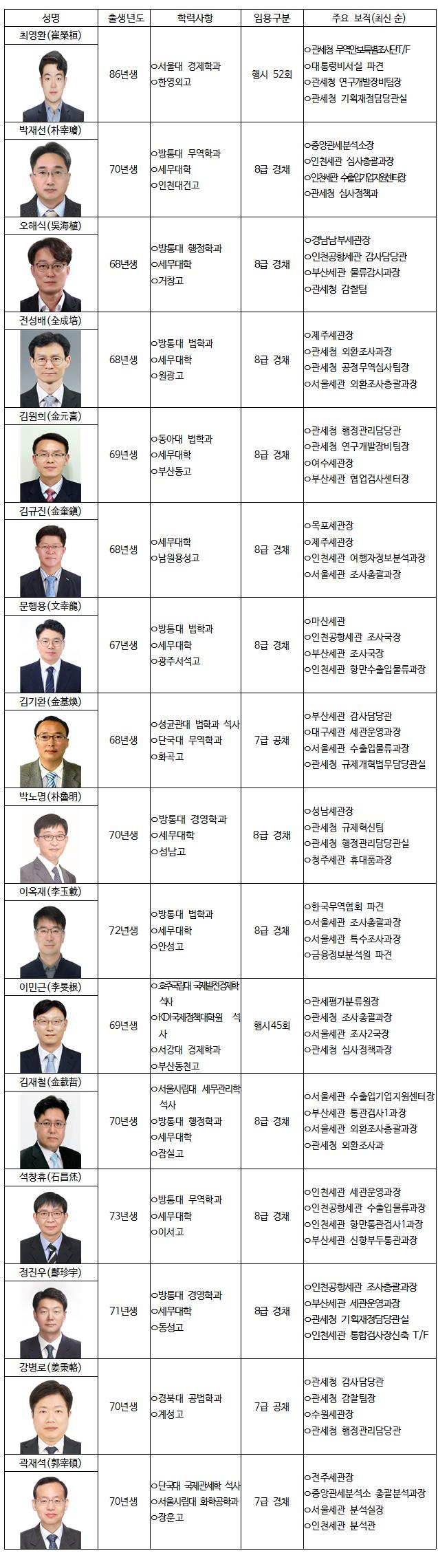 관세청은 11일 최영환 행정관리담당관, 박재선 인천공항세관 통관감시국장, 김원희 부산세관 통관국장 등 16명에 대한 과장급 전보인사를 7월 14일자로 단행했다. 관세청은 과장급 전보인사에 이어 7월말 국장급 인사를 단행할 예정이다.