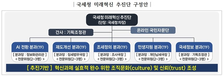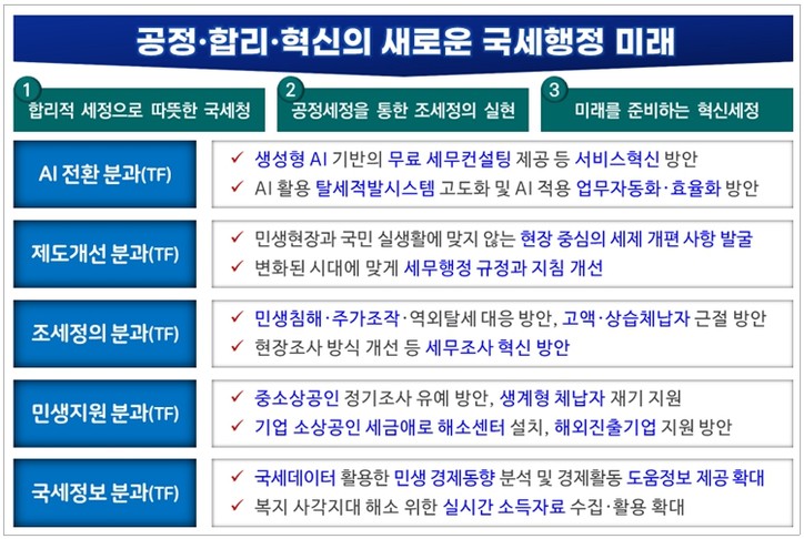 각 분과(TF)는 △AI전환 분과 △제도개선 분과 △조세정의 분과 △민생지원 분과 △국세정보 분과로 구성된다.