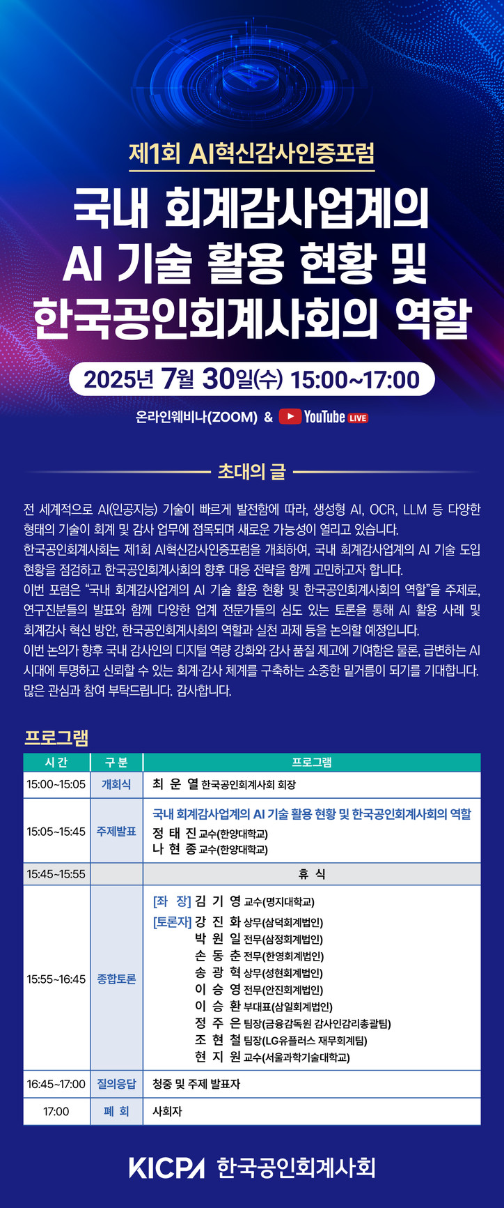 이번 포럼은 ‘국내 회계감사업계의 AI 기술 활용 현황 및 한국공인회계사회의 역할’을 주제로 열린다. 한양대학교 정태진 교수와 나현종 교수가 주제 발표를 맡아, 회계감사업계의 AI 기술 도입 현황을 점검하고 한국공인회계사회의 향후 대응 전략을 모색한다.