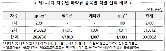 올해 제2차 작전에서 적발한 마약류를 품목별로 살펴보면, 지난해 작전 기간과 같은 1주일로 환산했을 경우 대마류는 6,148.2g으로 258% 대폭 상승하였으며, 필로폰과 케타민이 새로 적발되는 등 밀수 품목이 다양화되고, 규모 역시 대형화되고 있다.