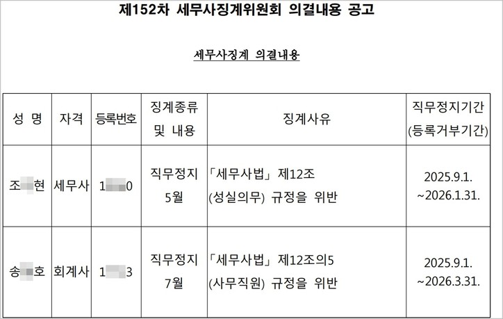다음은 25일 세무사징계위원회가 공고한 의결내용이다.