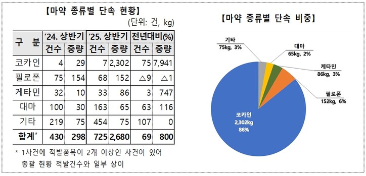 코카인은 지난해 상반기에 비해 적발 중량이 7941%(80배) 증가했는데, 이러한 코카인 밀수 증가는 우리나라뿐만 아니라 최근 아시아 지역 전반에 나타나는 동향으로 확인된다.