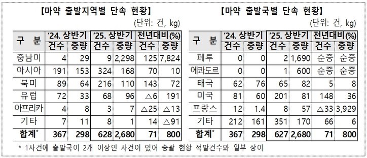 중남미는 그간 선박 등을 이용한 단발성 대형 마약밀수가 적발됐던 지역으로, 올해 4월 강릉 옥계항에서 페루발 코카인 1690kg(약 5633만명 동시투약 가능)과 5월 부산신항에서 에콰도르발 코카인 600kg(약 2000만명 동시투약 가능)이 연속으로 적발된 영향으로 작년 상반기에 비해 7824%, 79배 증가했다.