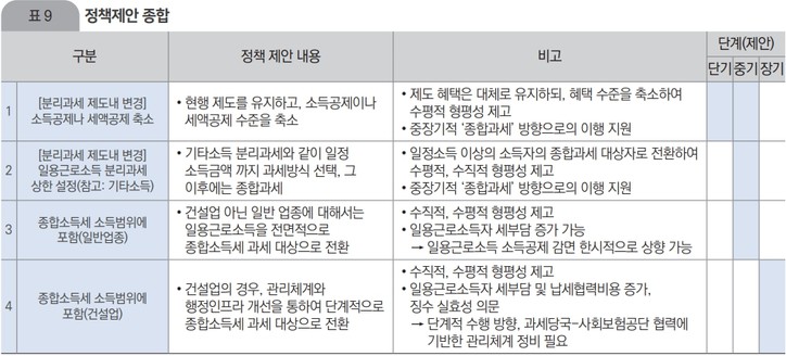 이에 김 연구위원은 “수직적·수평적 과세 형평성과 사회 보험료의 부과 형평성 제고를 위해 장기적으로 일용근로소득을 종합과세 대상으로 전환하는 것을 검토할 필요가 있다”면서 “충격을 완화하기 위해 단계적으로 현행 공제 혜택(일 15만 원 소득공제, 55% 세액공제)을 축소하거나, 일정 소득을 초과하는 경우 종합과세를 의무화하는 선택적 분리과세 제도를 도입하는 방안을 고려할 수 있다”고 덧붙였다.