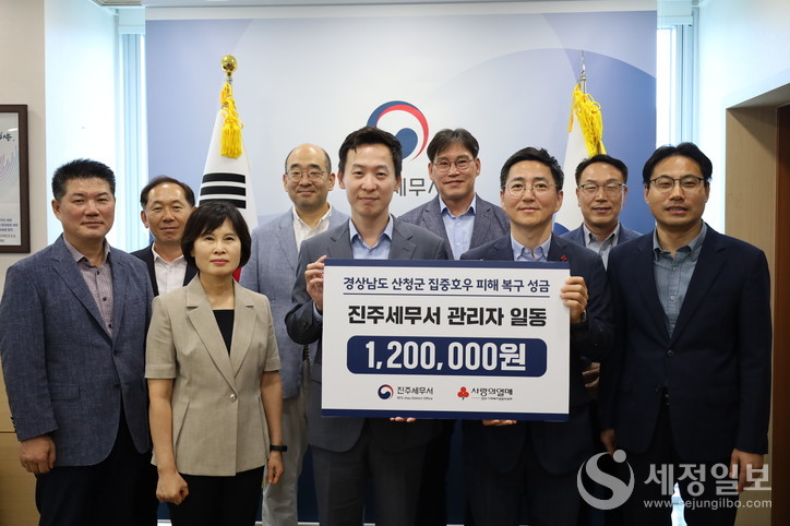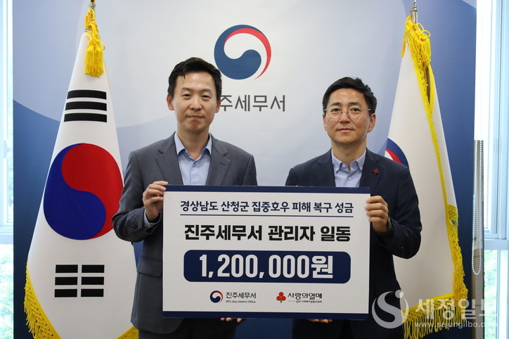 진주세무서(서장 신민섭)은 최근 집중호우로 큰 피해를 입은 경남 산청군 등 이웃을 돕기 위해 서장과 과장이 함께 뜻을 모아 29일 폭우 피해 이웃들을 위한 복구지원 성금 120만 원을 기탁했다고 밝혔다.