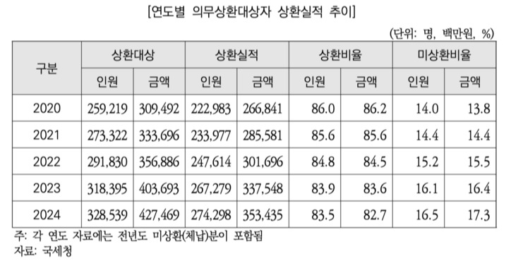 이에 따라 미상환에 따른 체납인원 및 체납액도 증가세가 지속되고 있다.