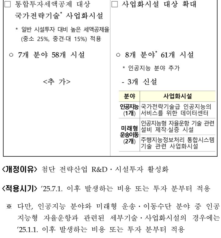 아울러 통합투자세액공제 대상 국가전략기술 사업화시설 대상에 인공지능 분야가 추가된다. 이는 일반 시설투자 대비 높은 세액공제율(중소 25%, 중견.대기업 15%)이 적용된다. 해당 국가전략기술 서비스 제공을 위한 데이터센터를 지정해 AI 인프라 조성을 전폭 지원하기 위함이다. 적용 시점은 올해 1월1일 이후 발생한 연구개발비 또는 투자분부터 적용된다.