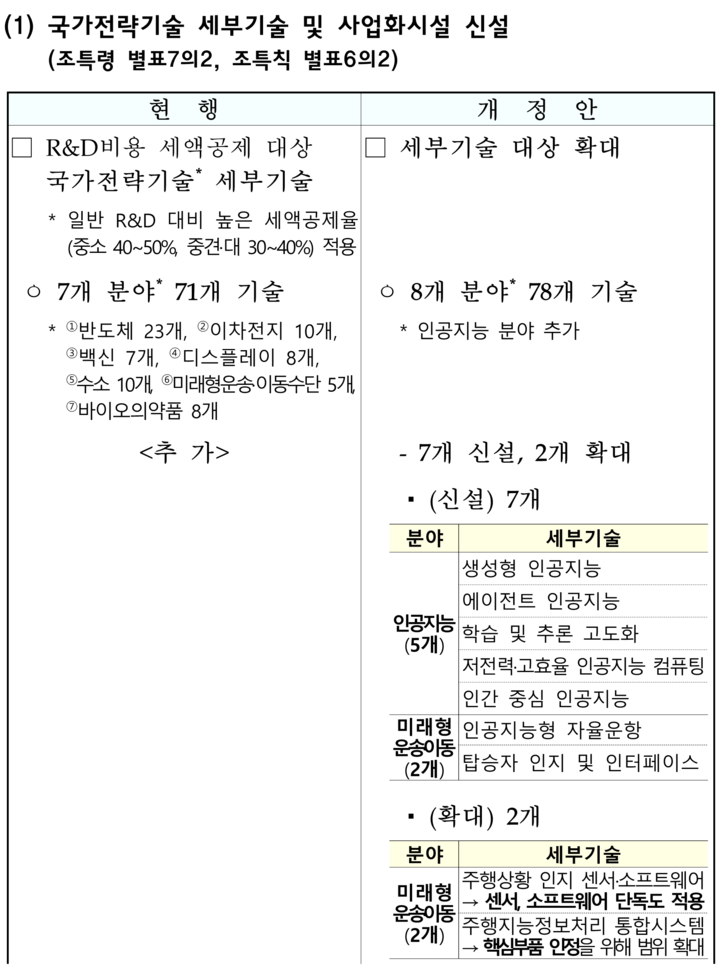 현행 R&D 비용 세액공제 대상 국가전략기술은 반도체, 이차전지, 백신 등 7개 분야 71개 기술이다. 국가전략기술로 선정되면 중소기업은 40~50%, 중견기업은 30~45%, 대기업은 30~40%의 세액공제를 받을 수 있다.