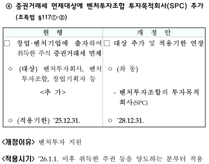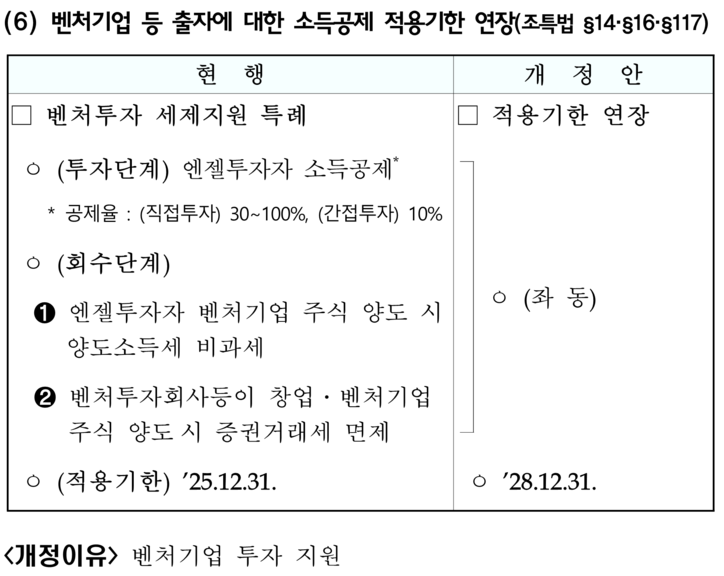 이 외에도 벤처투자조합, 코스닥벤처펀드, 벤처기업 등에 대한 출자·투자 소득공제 적용 기한이 `28년 말까지 3년 연장된다.