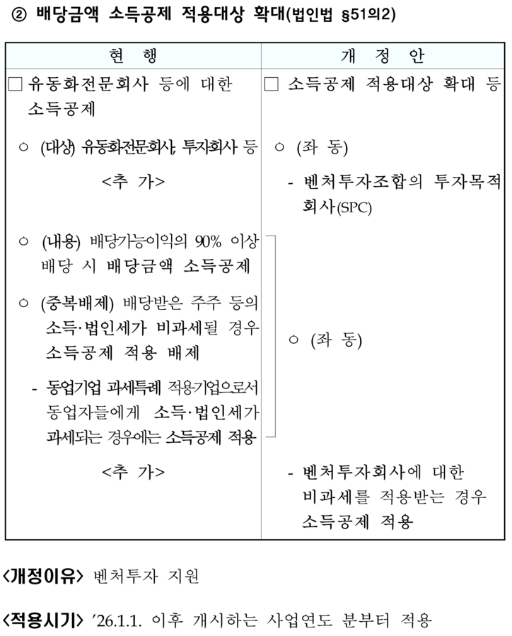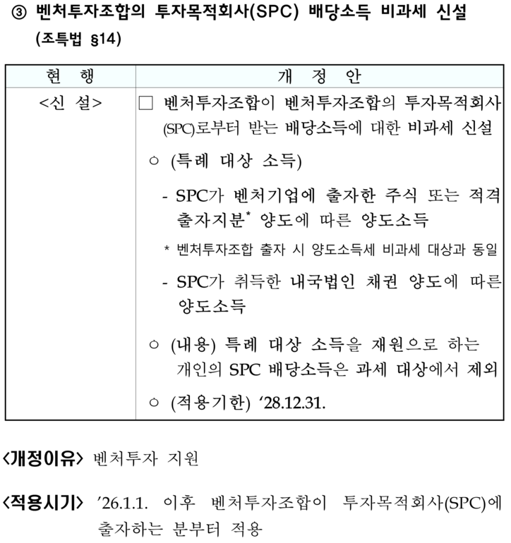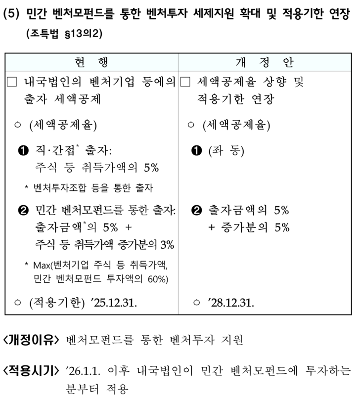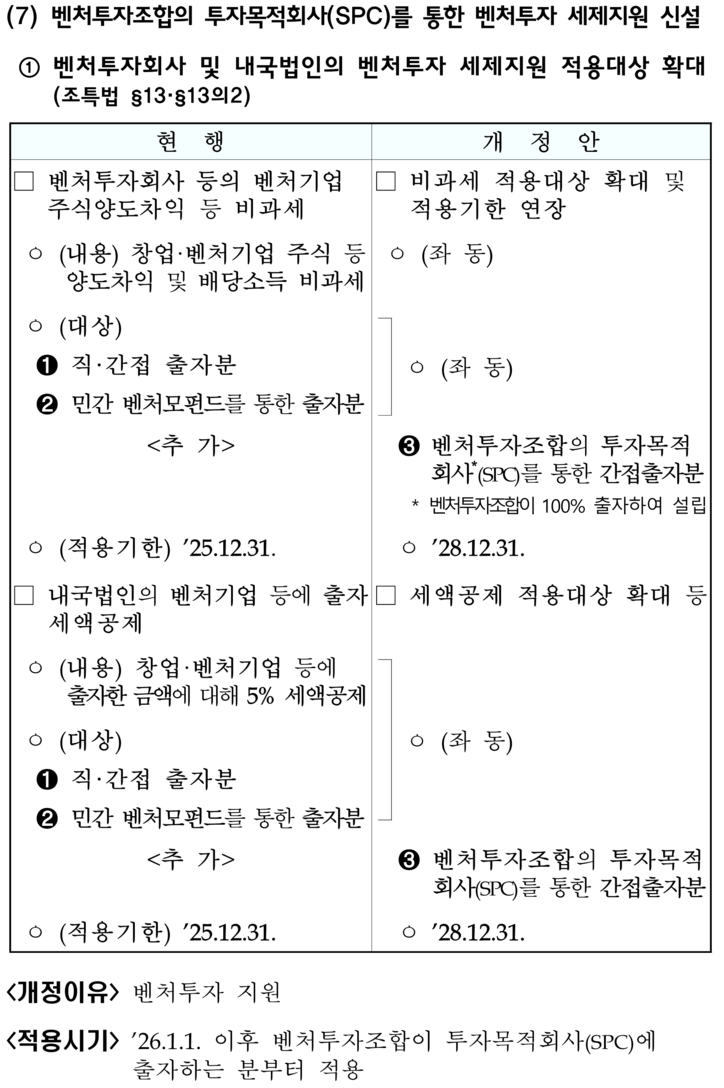 또한 정부는 벤처투자회사 및 내국법인의 벤처투자 세제지원 적용 대상을 확대한다. 벤처투자조합의 투자목적회사(SPC)를 통한 벤처기업 간접 출자 시 벤처투자조합을 통한 출자와 동일한 수준으로 지원한다고 밝혔다. 적용 기한은 `28년 말까지다.