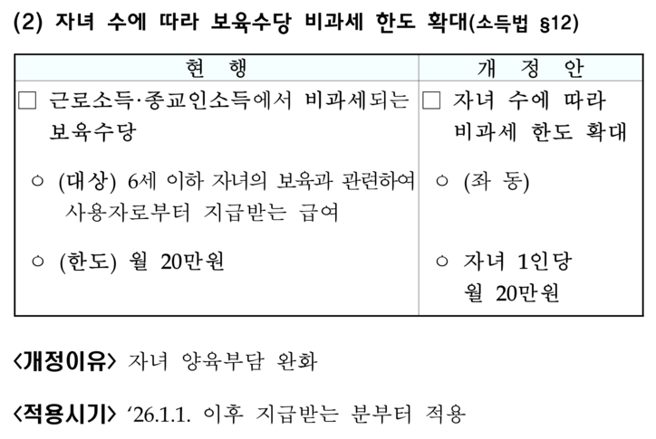 또한 정부는 월 20만원인 보육수당 비과세 한도를 자녀 1인당 월 20만원으로 확대하고, 육아휴직수당 등 비과세 대상과 한도도 확대한다.