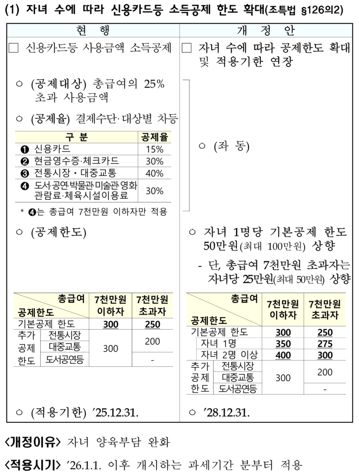 31일 기획재정부가 발표한 `25년 세제개편안에 따르면 신용카드등 소득공제 기본한도를 자녀당 50만원(최대 100만원) 상향한다. 단 총급여 7000만원 초과자는 자녀당 25만원(최대 50만원) 상향한다.